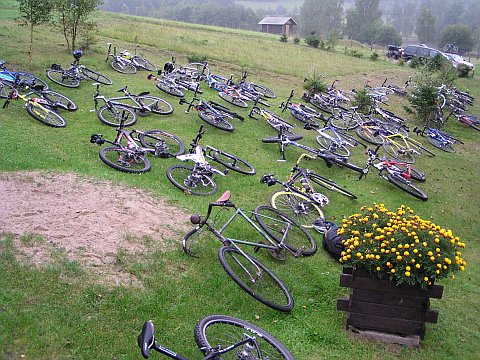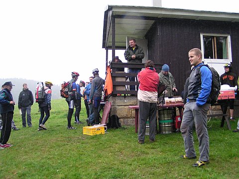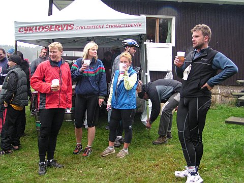 Během následujících minut se objevují další a další závodníci a já trojnásobně prohrávám sázku … Sedmdesát lidiček od Broumova, přes místní, Náchod, Nové Město, Jaroměř, Pardubice a početná banda z Hradce Králové… co ty lidi vede v takovém počasí valit 25 km na kole, běžet 4 km terénem a lít do sebe ledové nápoje? Bez ohledu na počasí panuje skvělá atmosféra. Startuje cyklistická část akce / tu vyhrává Petr Sulzbacher za 45:41 min / a průběžným pořadím trochu zamíchá i běžecká část závodů. Skutečným finále je však třetí disciplína. I když je chladící zařízení vypnuté, pivo má „venkovních“ osm stupňů a to přeci jen není mnoho. Nejrychlejší časy vypití pěti piv se pohybují kolem deseti minut / rekord akce je 4:35 min /, zatímco někteří se s tímto úkolem perou až hodinu a půl…