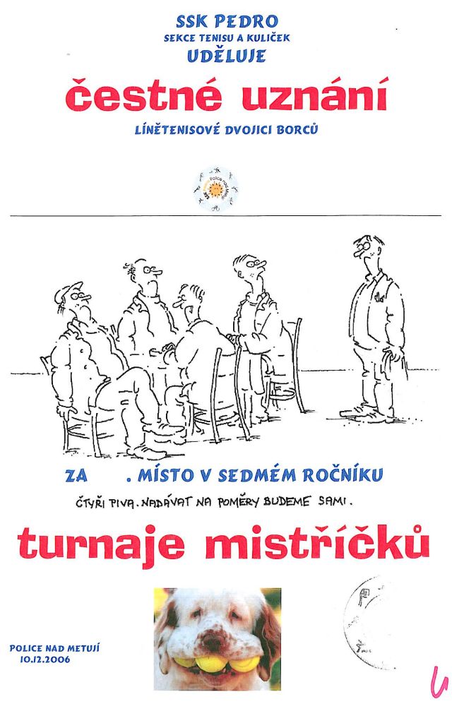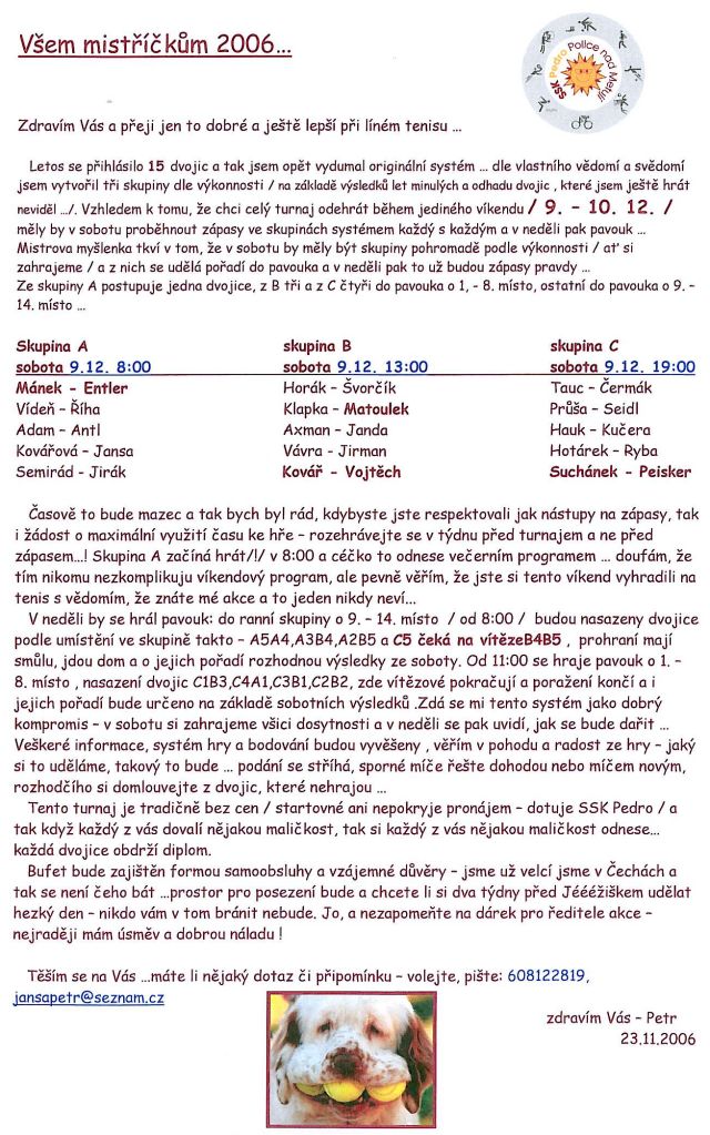 Závěr roku patří již tradičně dvěma tenisovým akcím v hale. SSK Pedro pořádá již sedmým rokem otevřené mistrovství křídové pánve nazvané „Turnaj mistříčků“. Patnáct dvojic letos svedlo urputné boje o celkové pořadí. Od sobotního rána přes noční boje až do nedělního odpoledne potilo na hřišti svá trika 29 chlapů a jediná žena… Díky nasazení do skupin byly ke shlédnutí opravdu bojovné a kvalitní zápasy, ve kterých si mnozí účastníci hrábli až na dno svých fyzických sil. O tom, že hra s molitanovým míčkem je vskutku něco jiného, než skutečný tenis se mohlo přesvědčit několik favorizovaných dvojic. Snad nejvíce doplatila na tenisové návyky dvojka Homolka – Dražinovský /celkově osmé místo/ a až 14. místem se příliš nevytáhl předseda Kája Semirád.