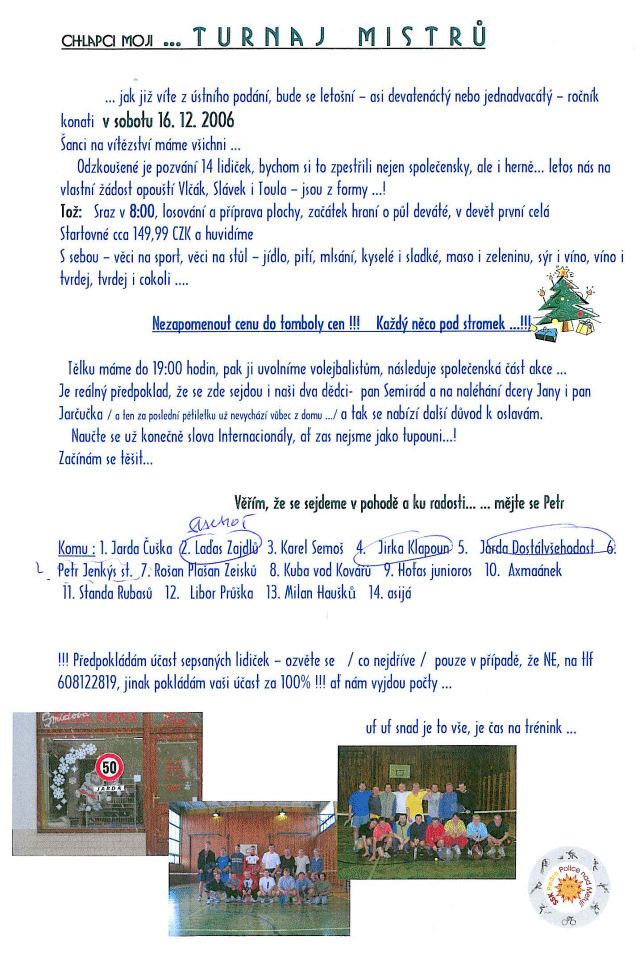 Skromnost stranou – název „Turnaj mistrů“ hovoří jasně. Závěr roku patří již 19. let sportovně společenskému setkání. Akce, která se stala krásnou tečkou za končícím rokem neměla ani letos chybu. Řezali jsme se u tenisu jako za mlada, nedali jsme si jediný míček zadarmo, občas letěla vzduchem i raketa /naštěstí jen ta tenisová a ještě – již tradičně – Hoťasova/ a hlavně jsme se také společně pobavili a nasmáli. A o tom to je. Putovního sádrového trpaslíka – tenistu si letos /a zaslouženě/ odnesla dvojice Libor Průša a Radek Pivnička. Na druhém místě se uhnízdil Milan Hauschke s Tomem Dražinovským a třetí místo si vybojoval Kája Semirád s mojí maličkostí … předseda opět na bedně !!! O vyrovnanosti svědčí i to, že o druhém až čtvrtém místě rozhodovaly – díky bodové shodě – vítězné sady.
